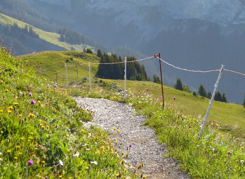 Ab Wilderswil nahm ich die Zahnradbahn, die in ca. 50 Minuten die „Schynige Platte“ erklimmt, einen Berg, der auf einer Flanke eine Gesteinsplatte zeigt, die, von der Sonne beschienen, leuchtet (scheint), daher der Name. Vor allem aber hat man von dort oben einen tollen Blick auf’s Jungfraumassiv, den Thuner See und alle umliegenden Berge.