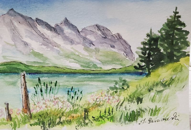 Das Bild oben enstand nach einem Foto aus dem Engelberger Tal, das mir meine Tochter geschickt hat, allerdings habe ich es frei umgesetzt. Unten noch eine kleine Zeichnung, die ich bei meiner Mutter angefertigt habe: ich hatte mein Malzeug nicht dabei und habe dann mit einem alten Aquarellkasten meines Vaters gearbeitet: weder Papier noch Pinsel waren eigentlich für Aquarell geeignet, aber es war interessant, zu improvisieren.