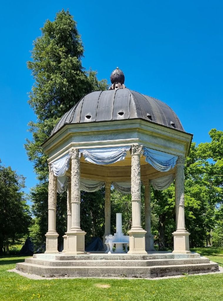 Der Monopteros bietet eine tolle Aussicht, teils bis zum See, teils bis zu den entfernten Alpen.