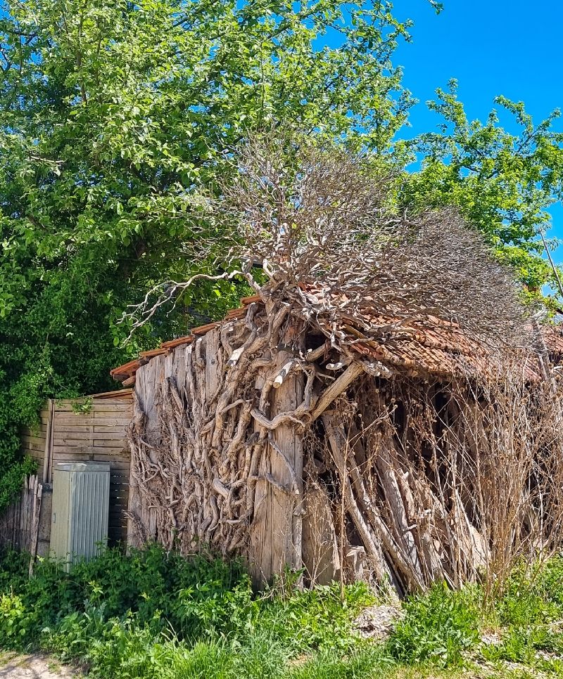 Dieses Blau, schon fast leicht ins Lila gehend, nennt sich „Haguenau Blau“, und geht auf die Hugenotten zurück. Haguenau ist die nächste Stadt bei Uttenhoffen. Ich jedenfalls finde es ganz besonders hübsch im Zusammenspiel mit den Gärten!