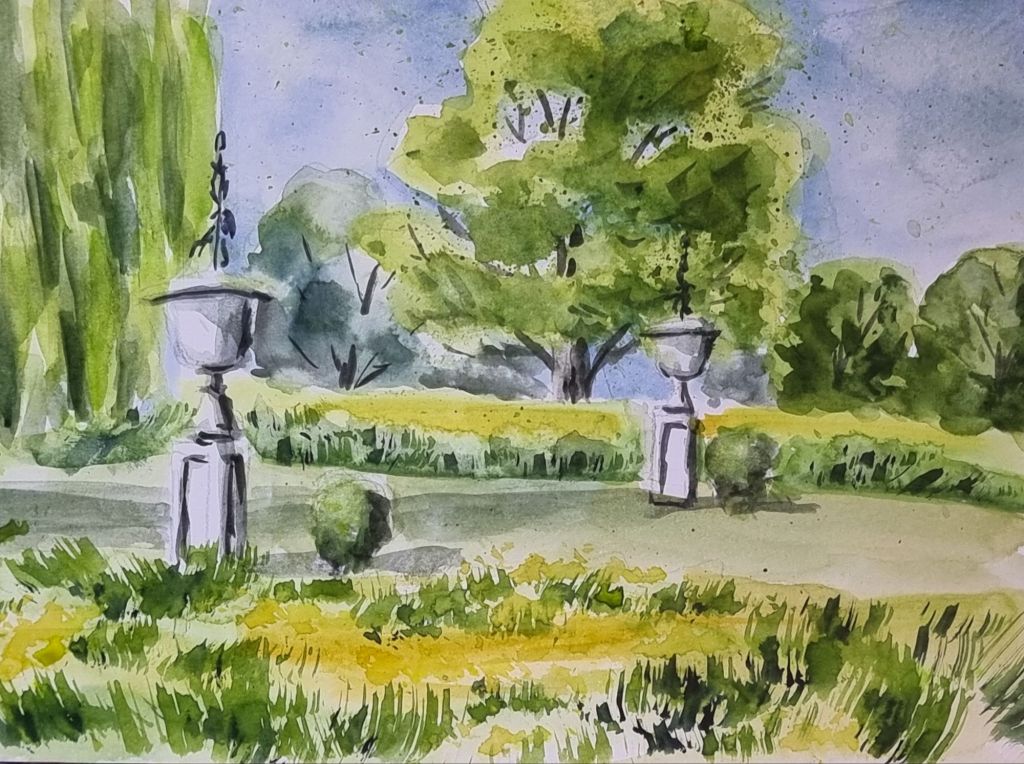 The watercolour above shows a nice corner in this public garden. Mostly, it’s about perennials, but there also are some rare and old exotic trees.