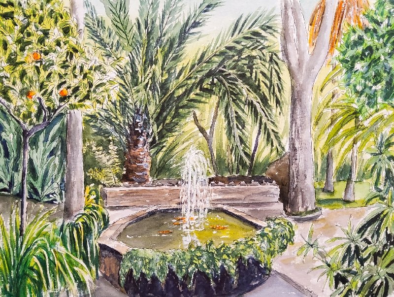 Many years ago I had spent a week in December on the island of Mallorca. In mixed weather conditions but pleasant temperatures and, most of all, very little tourism, we had a great time! Now I’ve used two of my photos of this trip as reference for watercolours. Above: a windy day at the cliffs; below: in the oriental gardens of Alfabia.