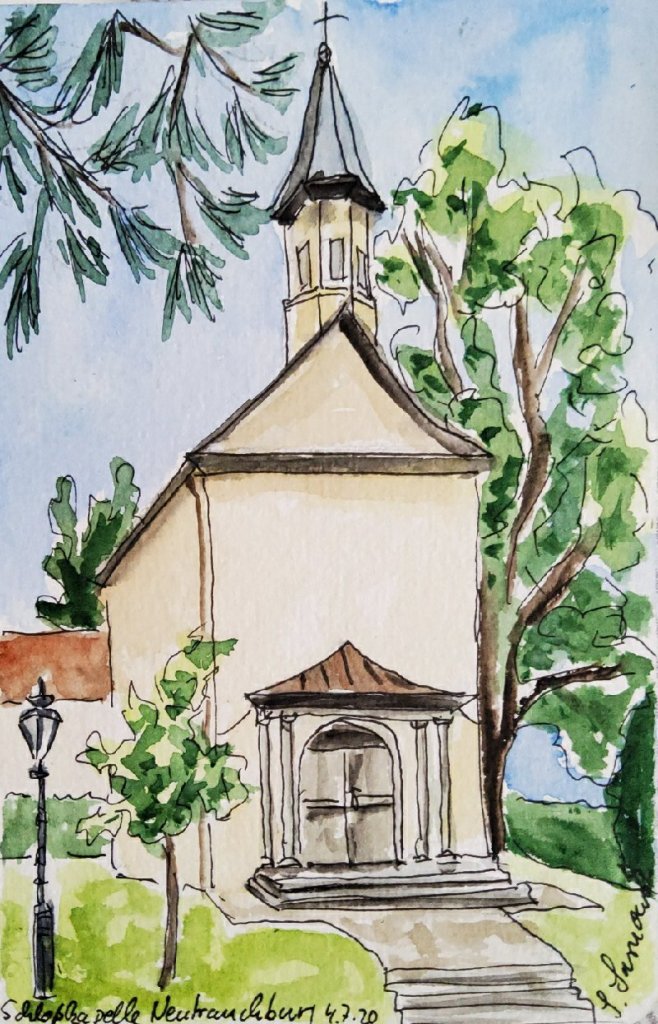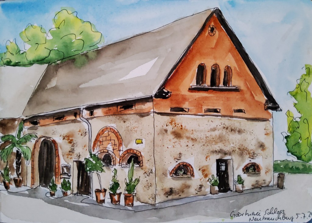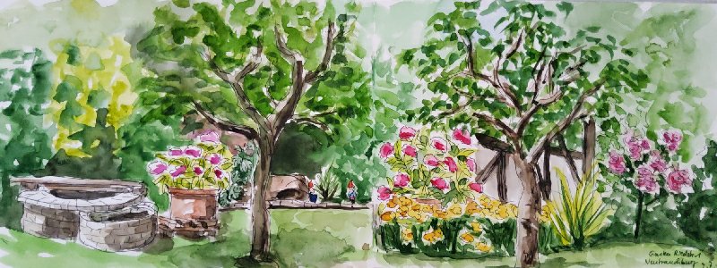 The sunny weather and the fact that now I’m able to bend my knee enough to sit on my small stool for outdoors sketching made me want to go on a little trip today. West of Augsburg there’s a monastery still lived in by nuns, but the former outbuildings now house a museum, an information centre about the natural park it is situated in, as well as a shop and a restaurant. On weekends it’s sometimes crowded, but on Monday everything is closed, so I could very quietly sit and paint for hours. Above: the small garden at the wall, 11,7×8,9 inches.