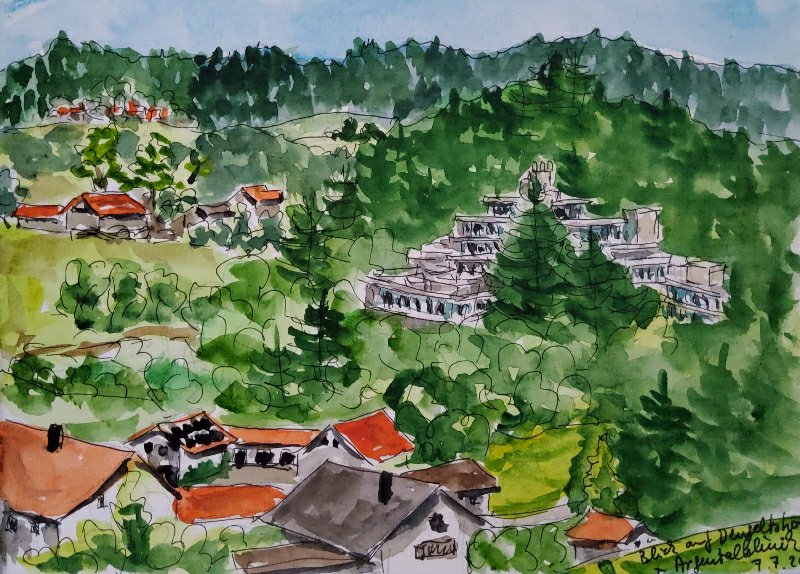 Then I went a bit further to sketch the „Stauden-house“, named after the area it is situated in. It’s 280 years old and sports a thatched roof overgrown by moss. The latter glows golden-green in the sunlight. That’s why I’ve chosen this view for painting instead of the front with balconies and geraniums. As you see, the roof is asymmetrical, so the front only shows a small part of it. Entering, you can visit the farmers museum. This watercolour is the same size as the one above.